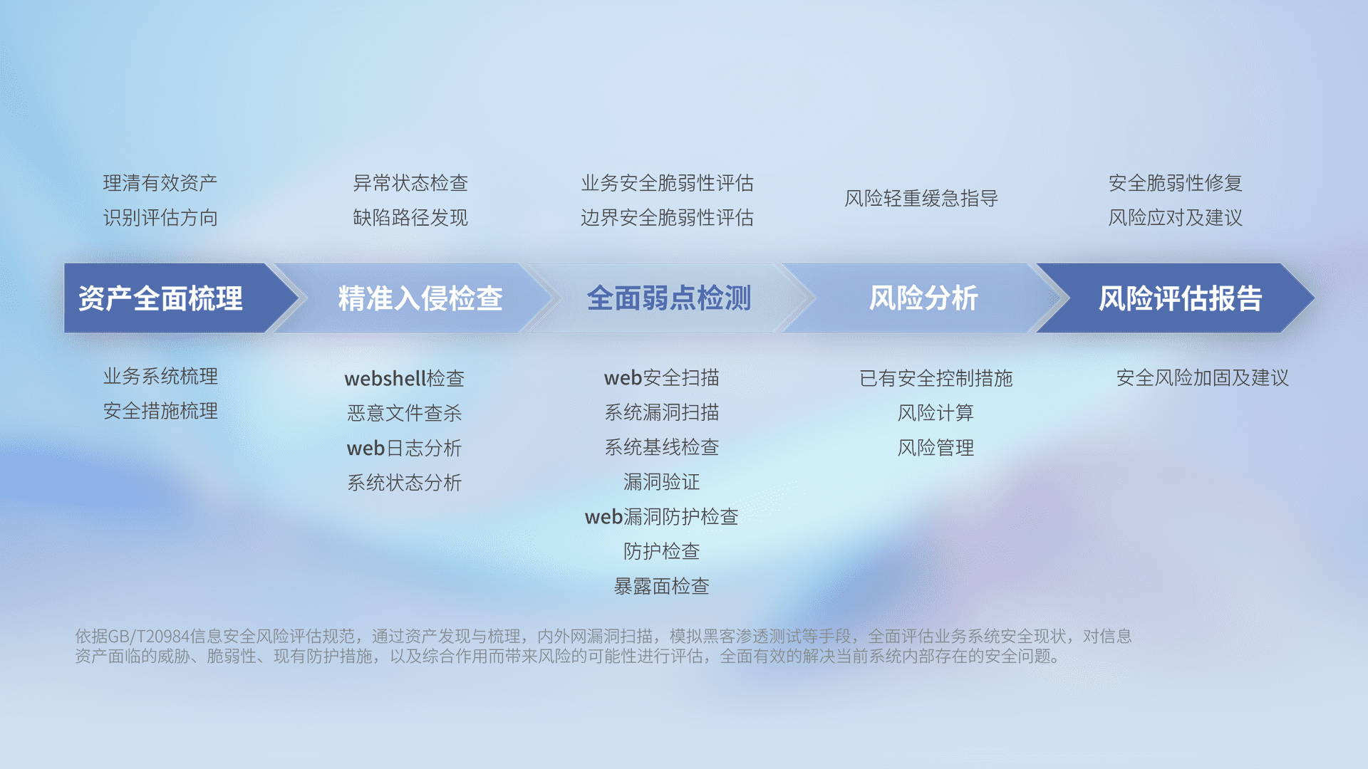 针对客户行业特性,,,,以专业的安全服务+多厂商联合解决方案提供专属的一站式安全管理服务,,帮助客户全面感知网络空间威胁,,,基于识别、、、、检测、、、分析、、防护、、、、监测、、、响应的服务理论模型,,,从方案咨询、、集成交付、、评估验证、、、、优化加固、、、运维运营,,致力于为客户提供完整的闭环管理式安全服务。。。。以实战经验为客户打造高抵御风险的安全体系,,帮助客户发现威胁、、对抗威胁、、处置威胁,,,不断积累安全对抗能力,,,,持续保障数字化安全。。。
