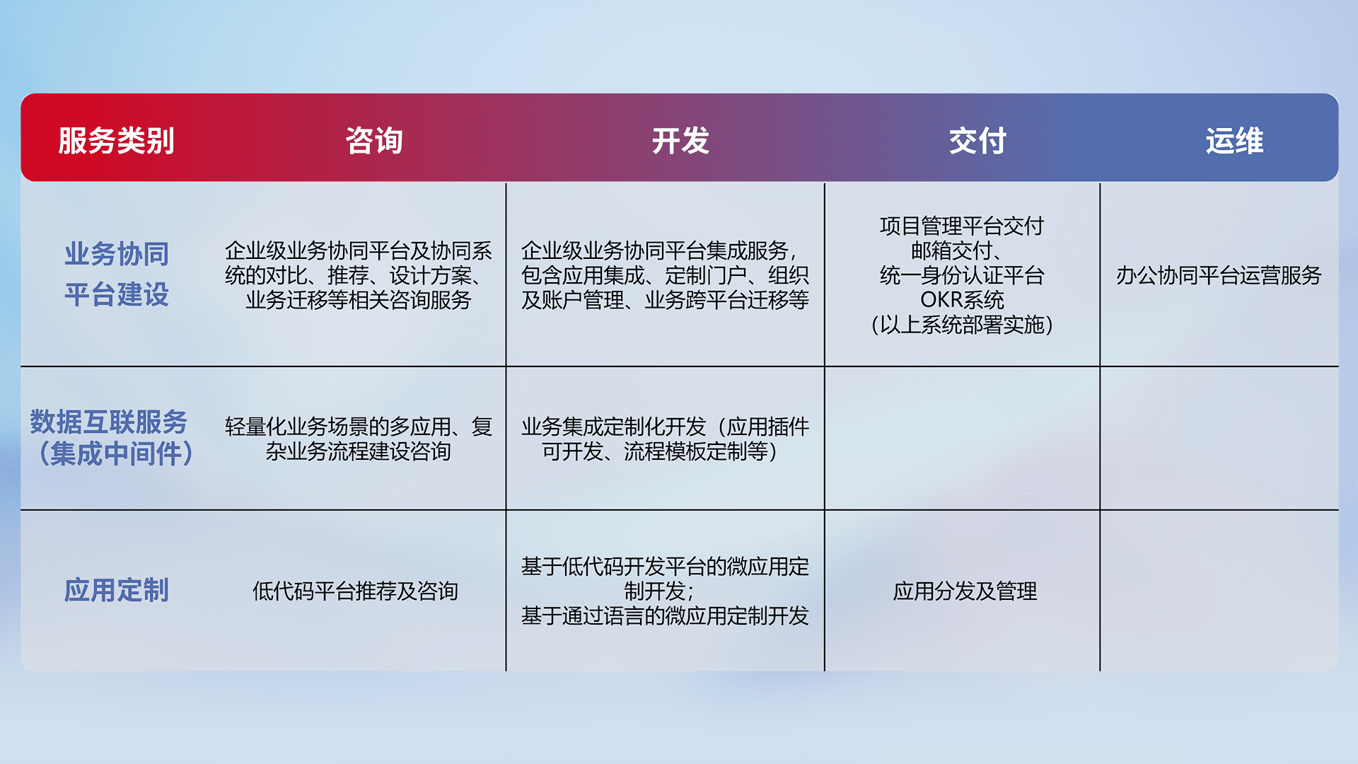 针对钉钉、、企微、、IDaas等平台级产品提供产品的规划、、、、方案、、交付、、、、定制化开发等服务,,,实现如统一协同办公、、、智能客户服务、、、、混合会议管理、、、、智能数据查询、、、等业务场景,,,,实现数字化转型。。